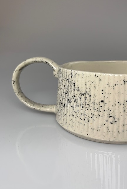 Glazura w odcieniu ciepłej bieli z czarnymi plamkami: subtelny efekt “pieprzu i soli” – każdy egzemplarz unikatowy